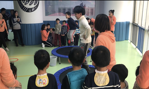 小朋友們先在跳床上跳高,然后跳圓圈,最后到到終點穿一顆珠子,哪一隊先珠子穿的最多就是獲勝小組。