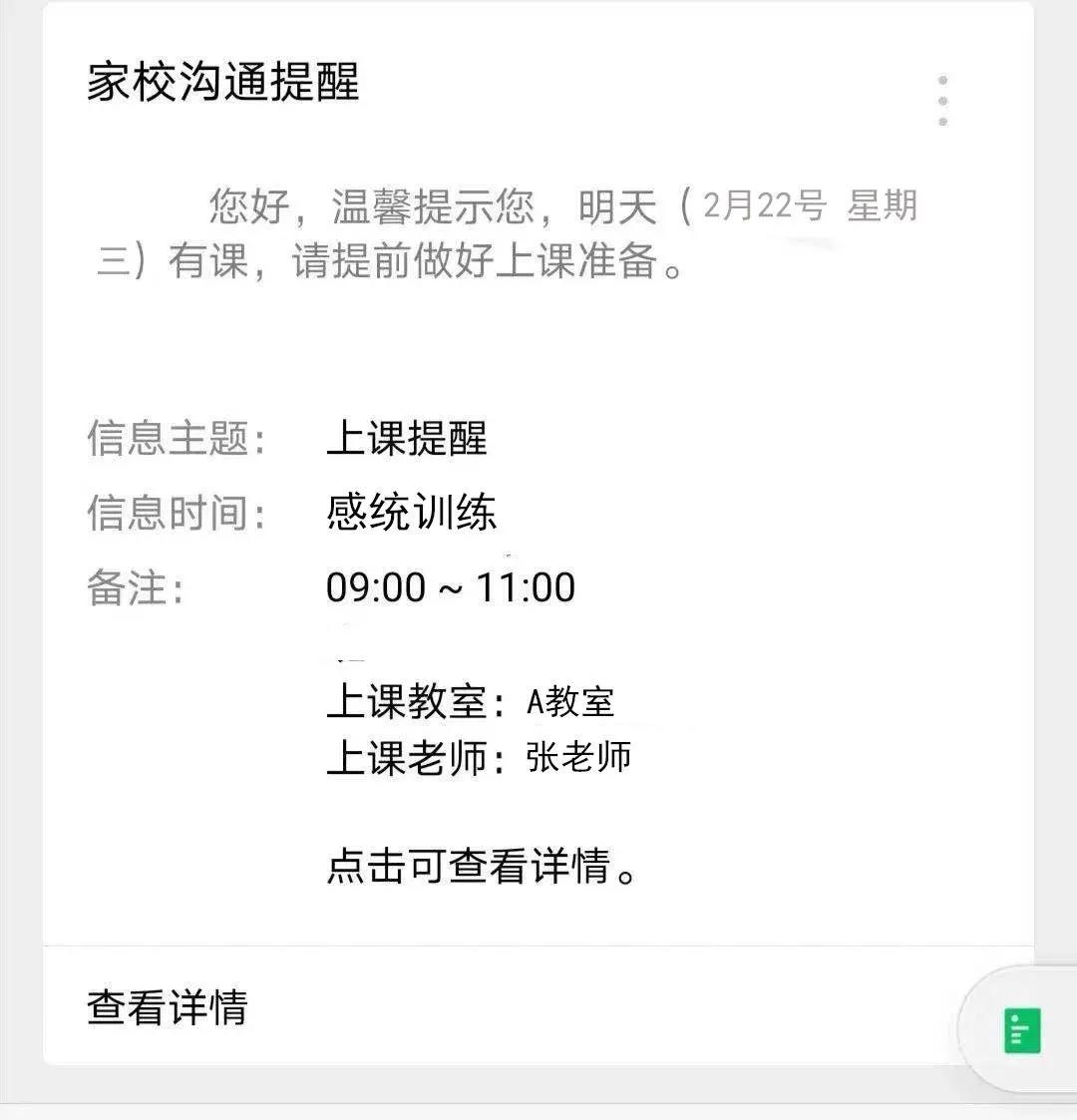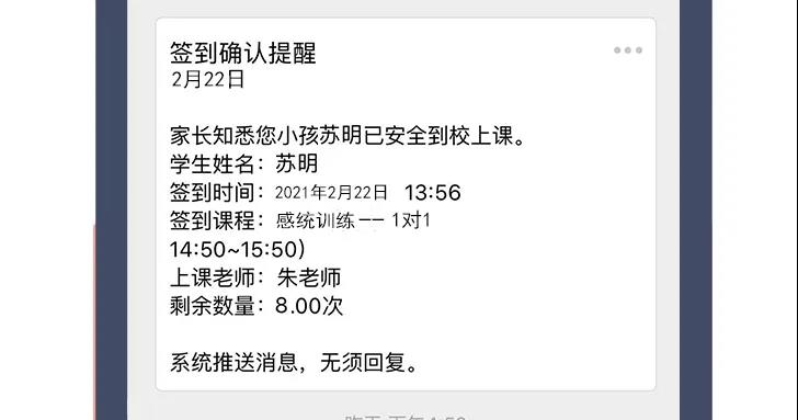 同時,您的手機端也可收到孩子的訓練提醒,簽到、消課信息一目了然。