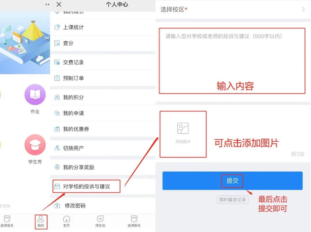 您和孩子可以在教師評價孩子的詳情頁底端,對老師的上課情況進行評價、提出建議與意見,