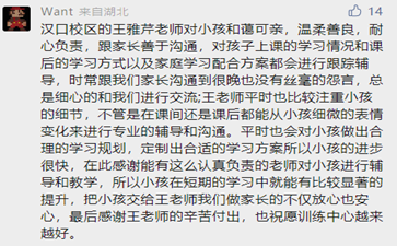 家長說,不管多晚王老師都會和他們交流孩子的情況;不管是課間還是課后,王老師總能通過孩子細(xì)微的表情變化來進(jìn)行專業(yè)引導(dǎo)和溝通,把孩子交給王老師,不僅放心,更安心!