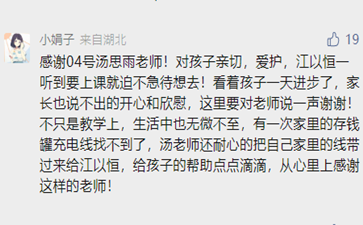 她在每一項訓(xùn)練時臉上都保持著微笑,讓家長們隔著屏幕都能感受到孩子的歡聲笑語。教師的心應(yīng)該充滿對每一個他要與之打交道的具體的孩子的愛,湯老師正是做到了差異化的愛與教學(xué)方式,才能得到這么多家長與孩子的喜歡。