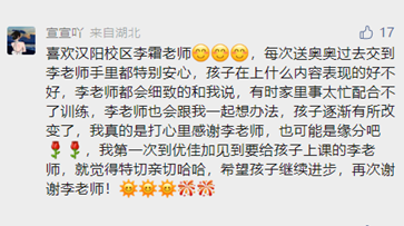 讓孩子能在開心的氛圍中提升能力,每次訓(xùn)練都有收獲,孩子遇到問題和困擾的時候也第一時間愿意跟李老師分享,李霜老師付出的愛心,寶貝學(xué)的開心,讓家長托付的放心。