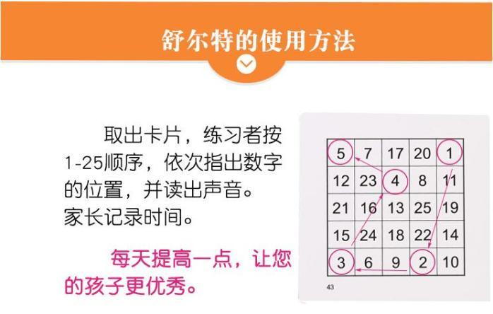2、舒特爾圖:學生快速轉(zhuǎn)動眼球,按照順序把數(shù)字從1-25找出來,這可以鍛煉學生眼球的追隨運動,提高視覺廣度,從而提升閱讀速度。